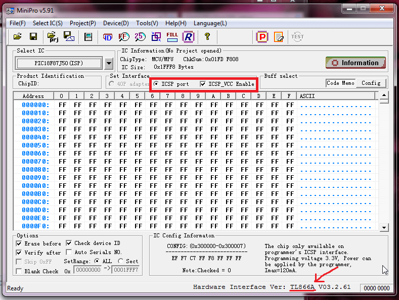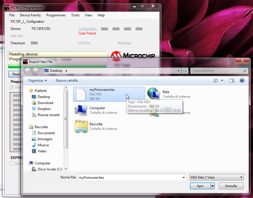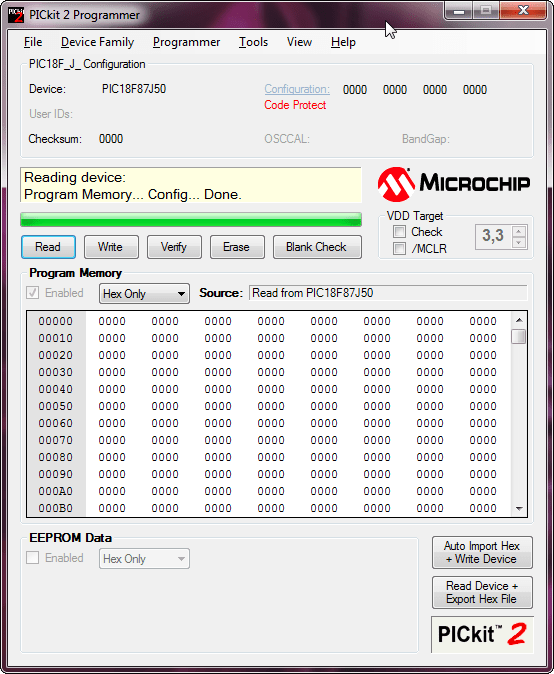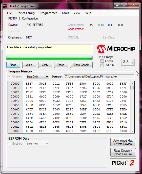 Prima di tutto, il minipro monta un PIC18F87J50… i tizi hanno pensato bene di grattare la superficie ma grazie al PicKit2 e alla funzione di autorilevamento è stato abbastanza facile arrivare ad identificare il pic montato.