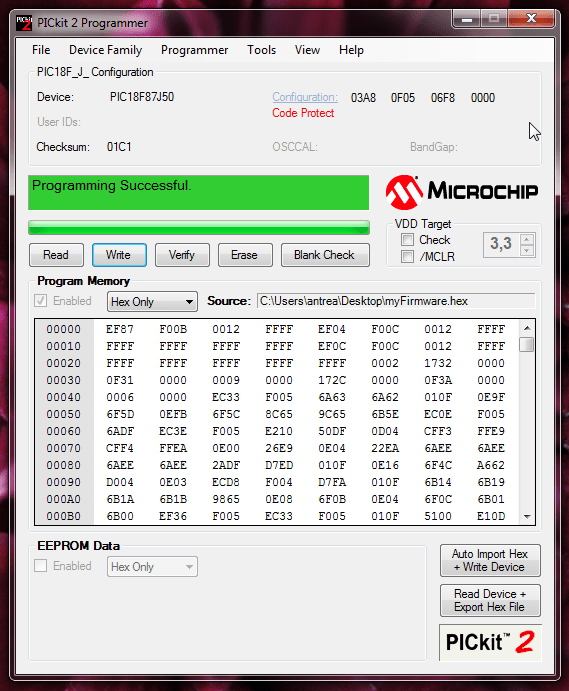 L’applicativo creerà un file .hex che sarà il nuovo firmware versione A, con DevCode e SerialNumber appena indicati, da caricare nel PIC18F87J50.